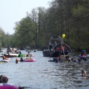 Der Zug startet zur Mittagszeit an der Spreebrücke in Neu Zittau. Im Zentrum stehen die 50 bis 200 Teilnehmer, die sich in Neoprenanzügen in die kalte Spree wagen und sich stromabwärts Richtung Erkner bewegen.